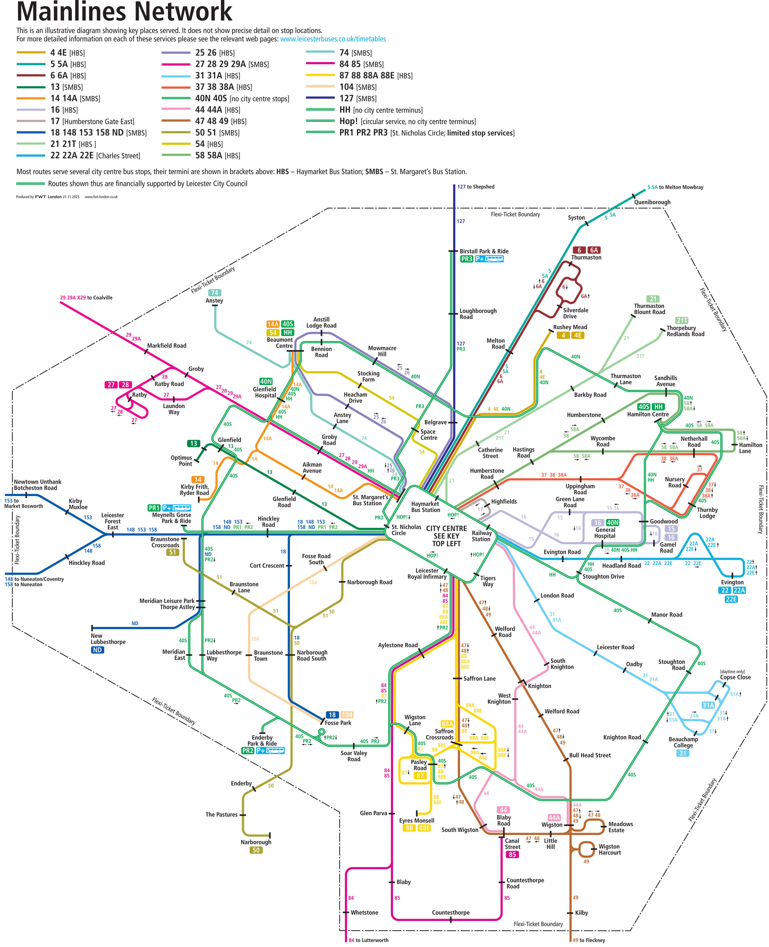 Each 'Mainline' is a group of one or more routes serving a common area of Leicester, often by different bus operators.